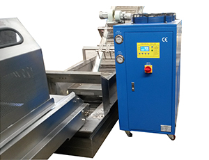 通過冷卻水或冷卻溶液使膠坯降溫,再經(jīng)過強制風(fēng)冷,使膠坯不變形、更加穩(wěn)定。該機特點是全程調(diào)節(jié)水平不銹鋼網(wǎng)帶調(diào)控運行速度,配合預(yù)成型機的所有切割速度。